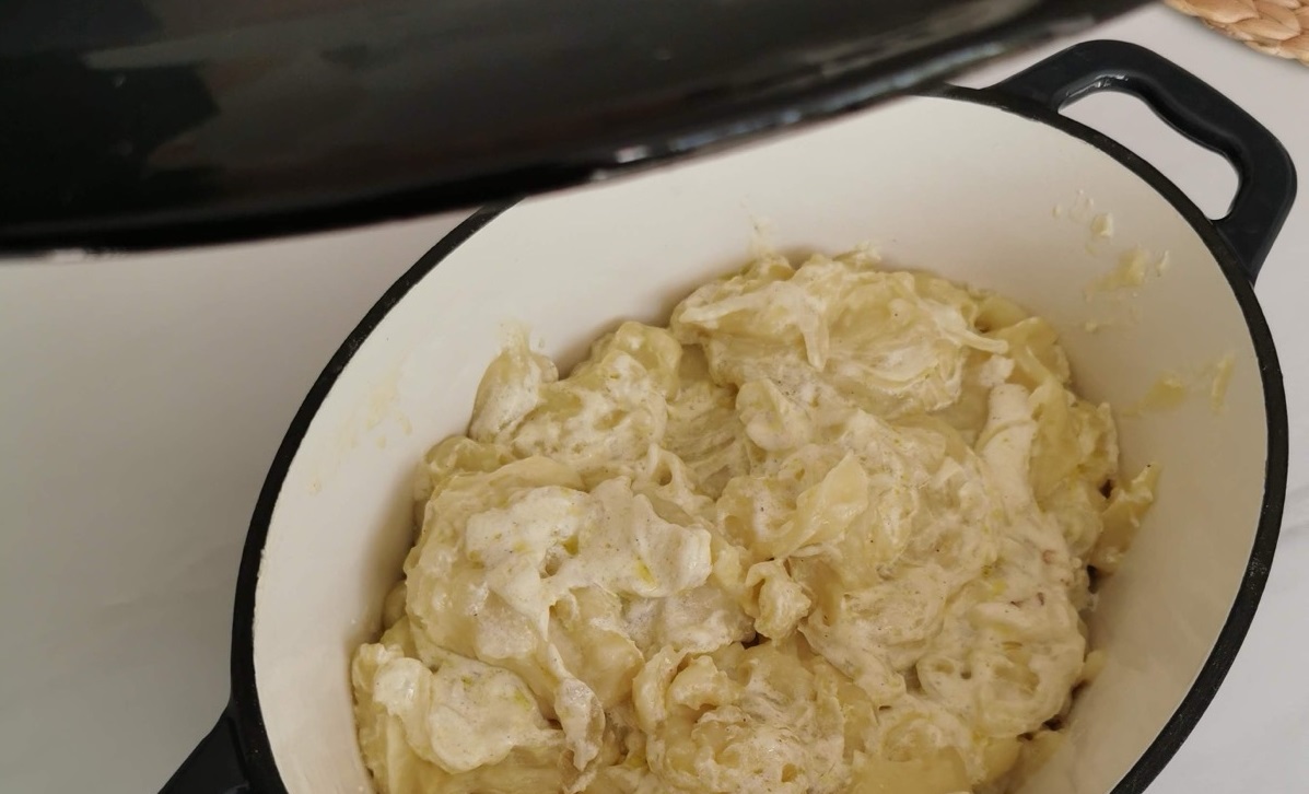 povsem kuhan, vsujemo v lonec še pšenično moko. Ko začne vreti, naredimo s kuhalnico